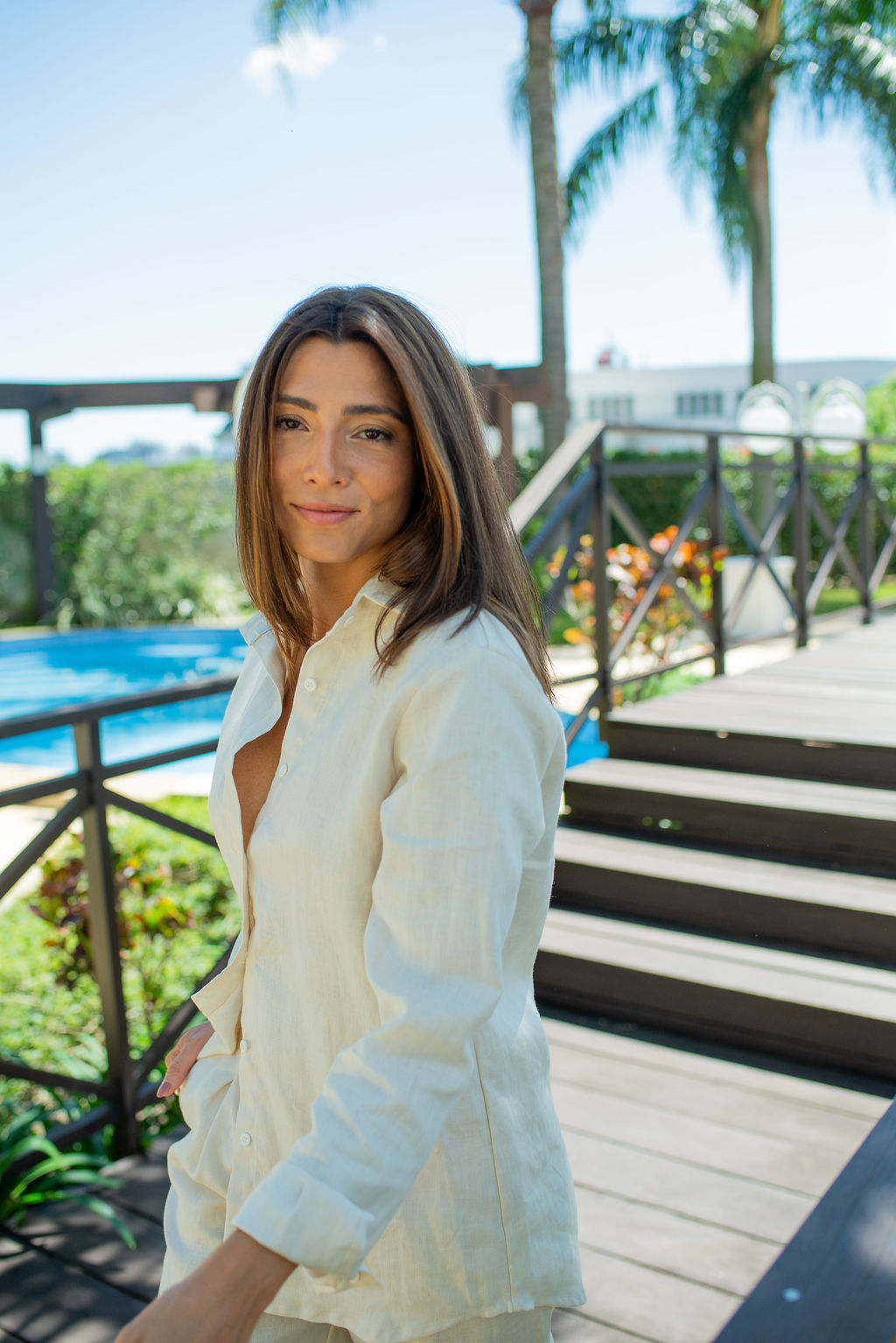O linho puro é uma fibra nobre super resistente, o que torna a peça durável. E a ideia é justamente essa: que ela te acompanhe por muitos anos. Além disso, o linho possui ótimo caimento e é uma fibra respirável, evitando odores (como todas fibras naturais que trabalhamos).
