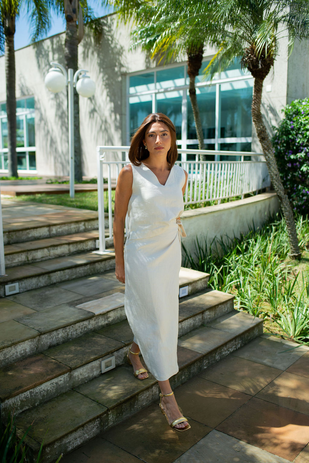 Saia midi estilo envelope com transpasse a amarração lateral. Modelagem reta, ajustável e super clássica, pode ser usada com blusas, camisas e blusões, em qualquer estação do ano.